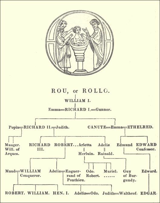 In honour of the second Henry, of the line of Roul, I have told the tale of Roul, of his noble parentage, of Normandy that he conquered, and the prowess that he showed. I have recounted the history of William Lunge-espee, till the Flemings killed him by felony and treason; of Richard his son, whom he left a child; [of the second Richard, who succeeded him; of his son the third Richard; who was soon followed by Duke Robert his brother, who went to Jerusalem, and died by poison; and now the tale will be of William his son, who was born to him of the 'meschine, Arlot of Faleise[9].']