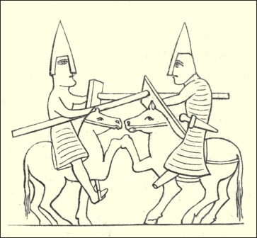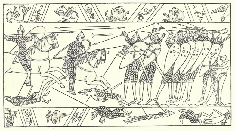 Great is the clamour and hard the strife; the swords are drawn, the lances clash. Many were the vassals to be seen there fighting, serjeants and knights overthrowing one another. The king himself was struck and beat down off his horse. A Norman whom no one knew had come up among them; he thought that if the king should fall, his army would soon be dispersed; so he struck at him 'de travers,' and overthrew him, and if his hauberk had not been very good, in my opinion he would have been killed. On this account the men of that country said, and yet say, jeering,