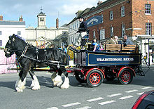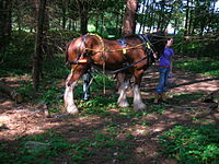 A draft horse (US), draught horse (UK and Commonwealth) or dray horse (from the Old English dragan meaning "to draw or haul"; compare Dutch dragen and German tragen meaning "to carry"), less often called a carthorse, work horse or heavy horse, is a large horse bred to be a working animal doing hard tasks such as plowing and other farm labor. There are a number of breeds, with varying characteristics, but all share common traits of strength, patience, and a docile temperament which made them indispensable to generations of pre-industrial farmers.