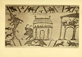 published in 1767, where he reproduced the drawings given by Montfaucon, and printed an elaborate description which had been drawn up some years previously, during a residence in Normandy, by Mr. Smart Lethieullier. Dr. Ducarel tells us that when he was in Normandy the tapestry was annually hung up on St. John's Day, and that it went exactly round the nave of the cathedral, where it continued for eight days. This mode of decorating the cathedral of Bayeux was a most ancient custom, as we learn from its statutes, which declare that, "II est bon de savoir que le matin du samedi de Paques, avant d'appeler les dignitaires et les chanoines au service, on pare le tour de l'eglise, dans l'interieur, avec des tapisseries propres, au-dessous desquelles, entre le choeur et l'autel, on place des coussins et des draps de soie les plus beaux qui se trouvent dans l'eglise. . . . L'eglise se pare depuis la fete de Paques jusqu'a le Saint-Michel, en septembre." When not employed as a decoration for the nave, the tapestry was carefully preserved, in a strong wainscot press, in a chapel on the south side of the cathedral.